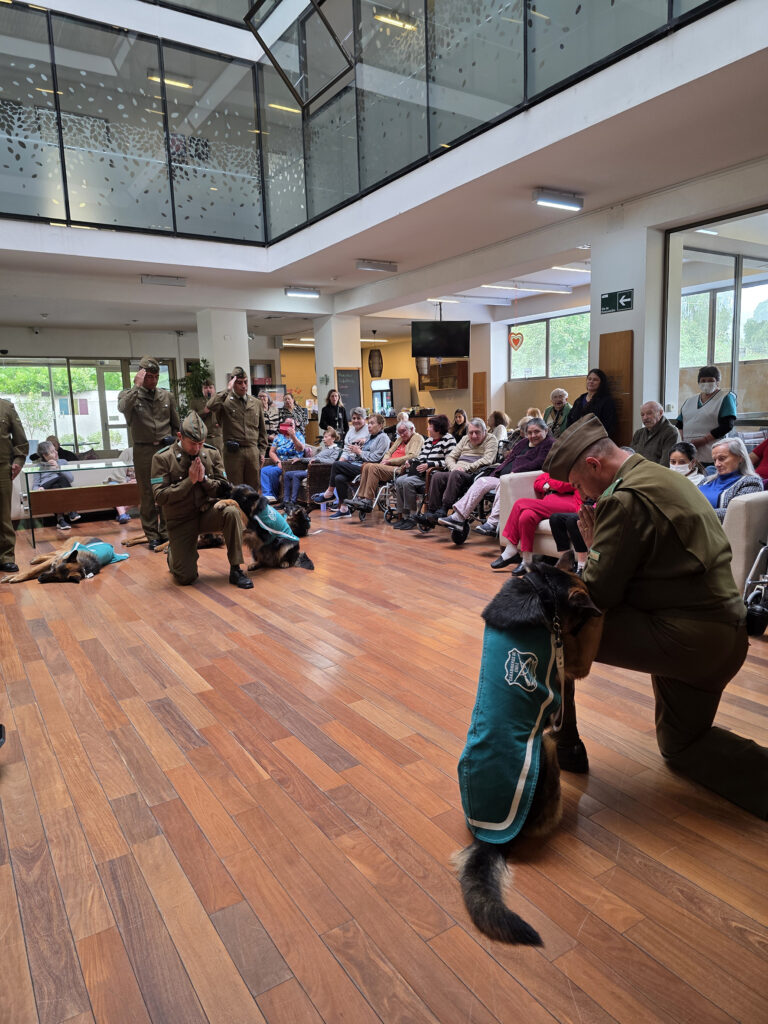 Uno de los momentos más memorables fue la visita del grupo de adiestramiento canino de Carabineros, quienes realizaron una presentación llena de ternura y destreza. Tanto residentes como funcionarios disfrutaron profundamente de esta instancia, que llenó la residencia de sonrisas, sorpresa y emoción.